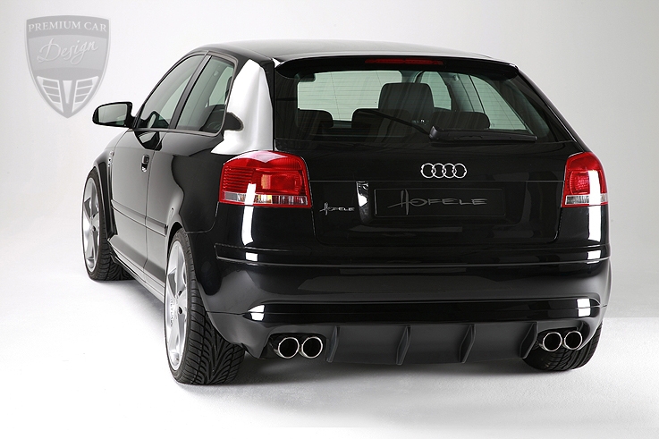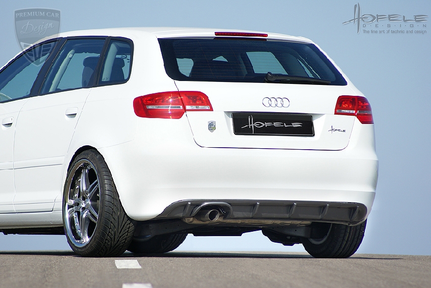 A hátsó diffúzor, amelyet kapott jármű szintén felszerelhető minden Audi A3 8P pre-facelift modellre. Elérhető a 4 csöves Hofele kipufogó rendszer fogadására alkalmas kivitelben is, de kérhető a termék egy kipufogó cső kivezetésére alkalmas kivitelben is, a gyári kipufogóhoz.