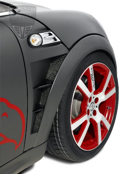 Az első lökhárító, amely egy új első légterelőt kapott (a karosszériával megegyező színűre fényezettet), a szélesítésekkel és a kiemelkedő élekkel egyértelműen az autó vizuális csúcspontját jelenti.